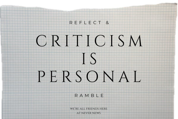 I sat down to write about the process of criticism – and to pitch to you, my Never Newsies, a bit of a system, and found myself wrestling with defining, legitimizing, and defending the practice.
